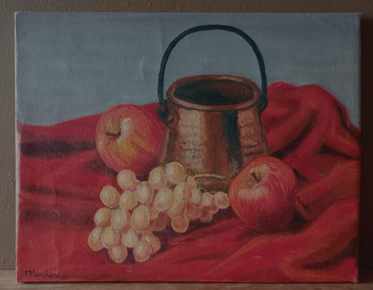 Antique still life. Copper with fruit