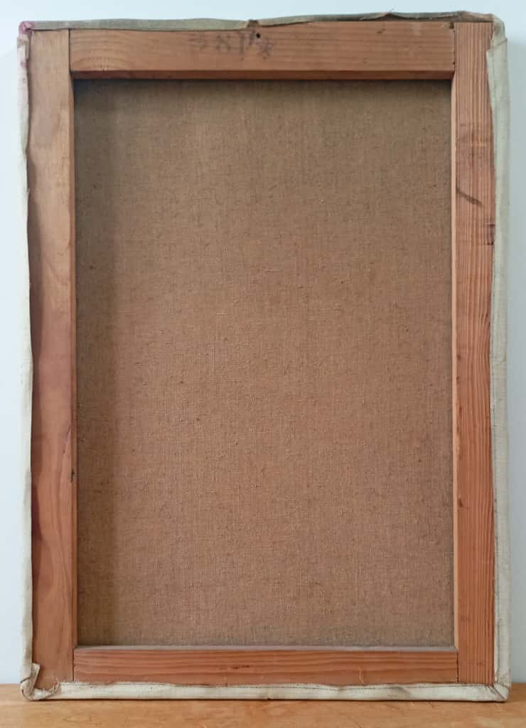 Tableau aux couleurs chaleureuses mettant en scène une sculpture de la vierge du rosaire près d'un bouquet de fleurs.