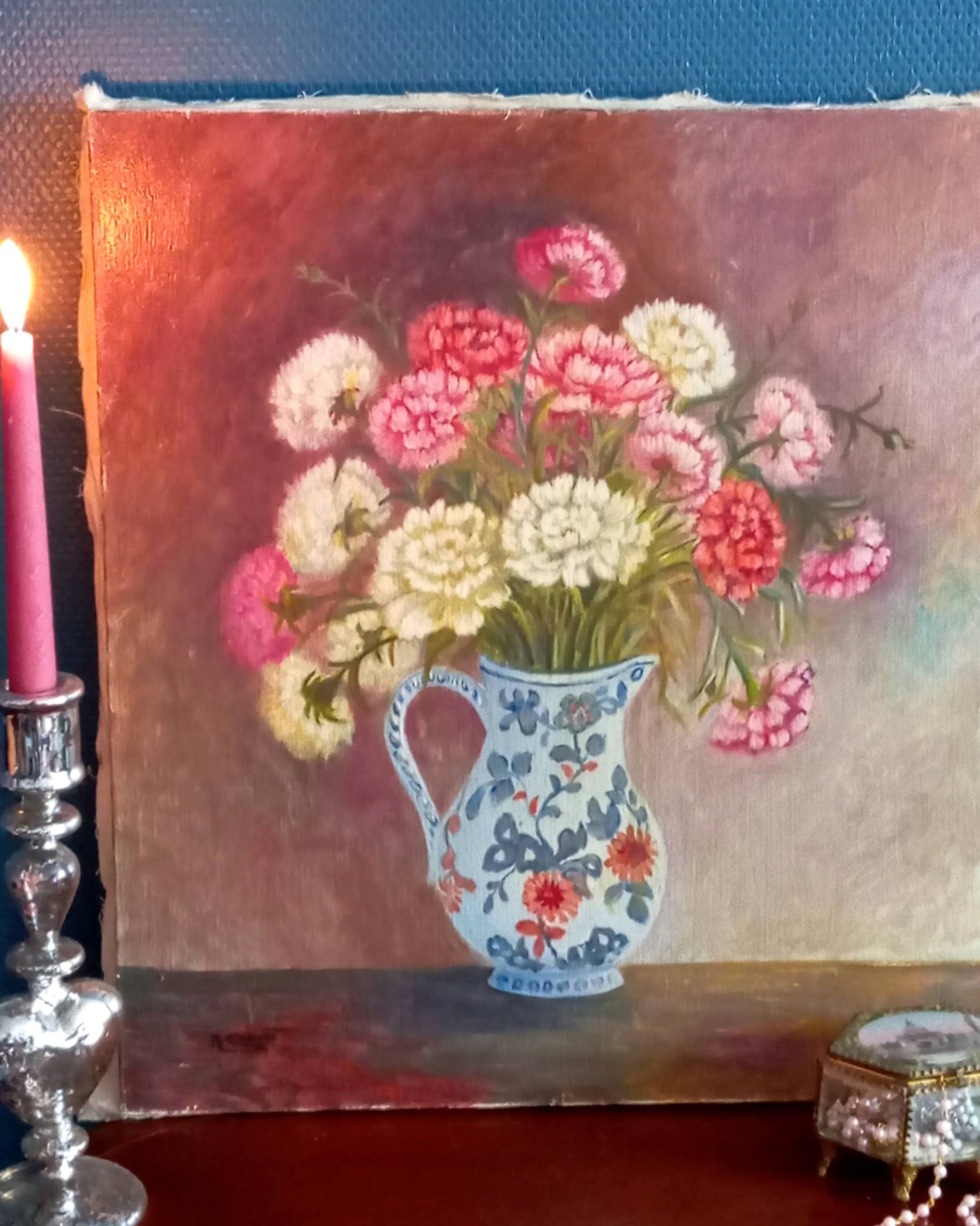 Bouquet d'oeillets disposés dans une cruche en céramique.